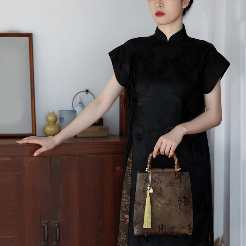 Buddha Stones Bolso con asas de bambú, hojas de bambú, mariposas, peces koi - Bambú verde amarillento 23*25*8,5 cm - image 28