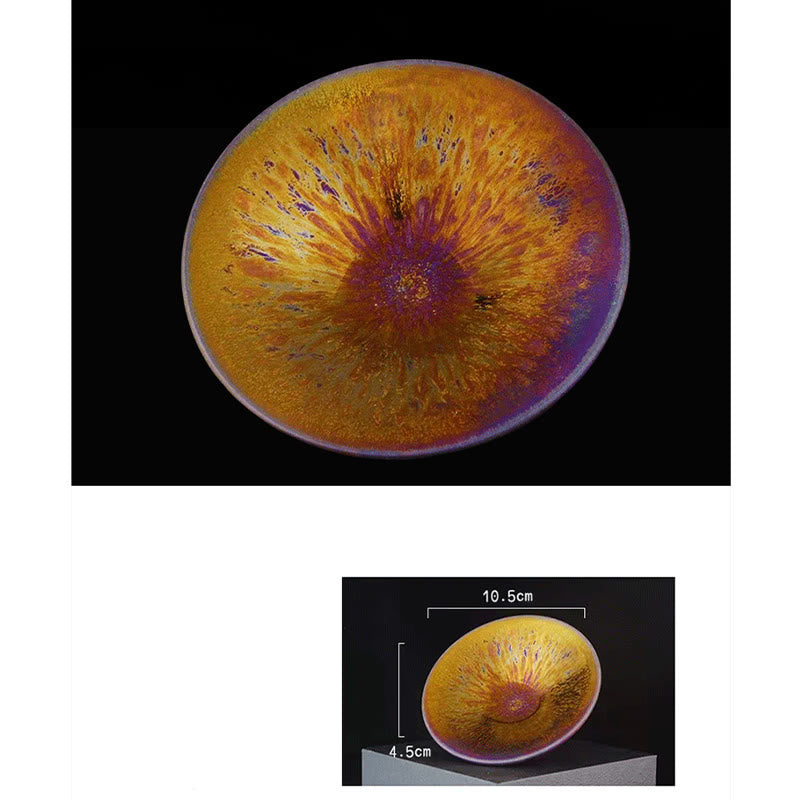 Estas tazas son amadas por su esmalte oscuro y espeso con coloridos "efectos especiales". Estos patrones especiales se logran mediante cocción a alta temperatura, de modo que el esmalte comienza a cristalizar en hermosos patrones. Los patrones que pueden aparecer podrían ser, por ejemplo, rayas, plumas o manchas de aceite.
