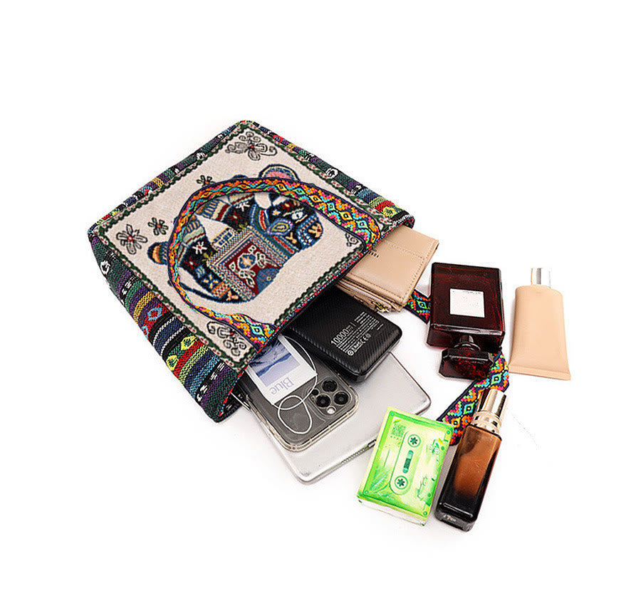 Bolso bandolera de lona de gran capacidad con bordado de mariposa y elefante