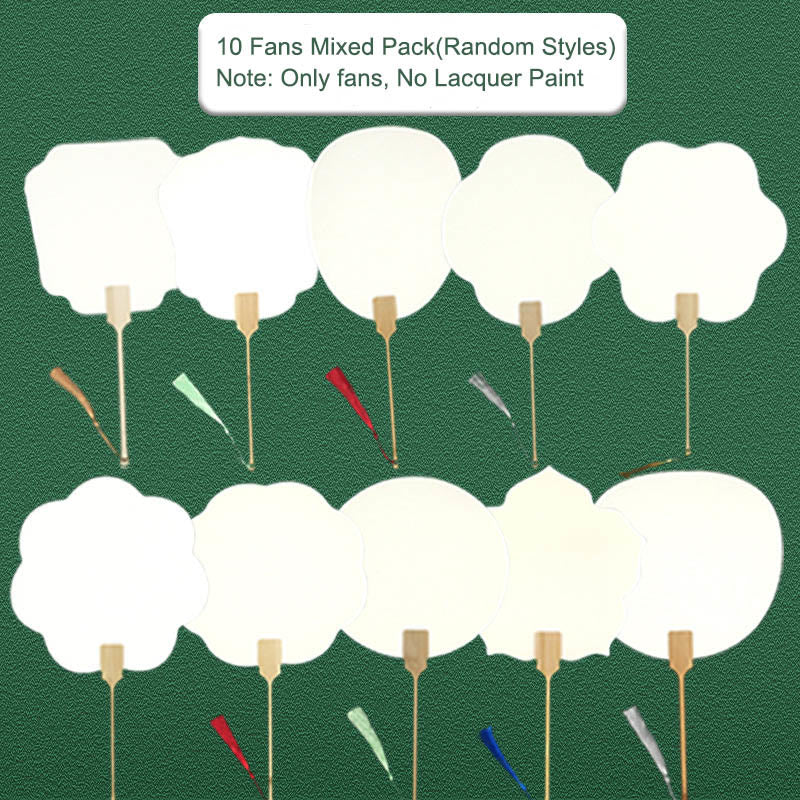 Juego de 60 piezas para blanquear pintura : paquete mixto de 10 abanicos (estilos aleatorios), abanico de tela * 4 (estilos aleatorios), abanico plegable pequeño en blanco * 1, abanico plegable grande en blanco * 1, palitos para revolver * 10 (colores aleatorios), pintura de laca de 6 colores, cinta adhesiva * 3, guantes desechables * 10, clips para colgar * 15 (colores aleatorios);