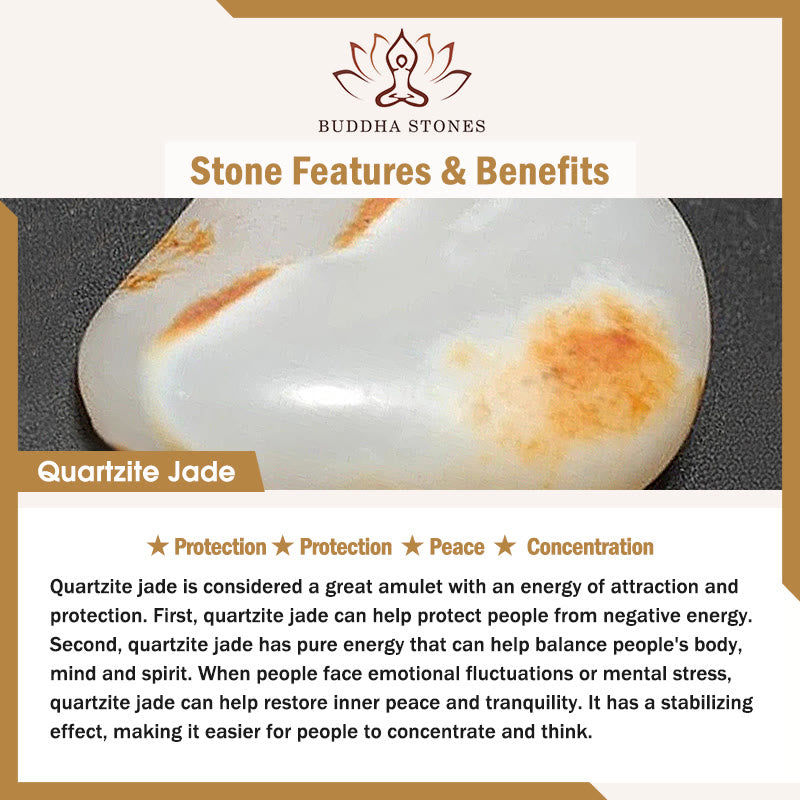 El jade cuarcita se considera un gran amuleto con energía de atracción y protección. En primer lugar, puede ayudar a proteger a las personas de la energía negativa. En segundo lugar, posee energía pura que puede ayudar a equilibrar el cuerpo, la mente y el espíritu. Cuando las personas enfrentan fluctuaciones emocionales o estrés mental, el jade cuarcita puede ayudar a restaurar la paz interior y la tranquilidad. Tiene un efecto estabilizador, facilitando la concentración y la reflexión.