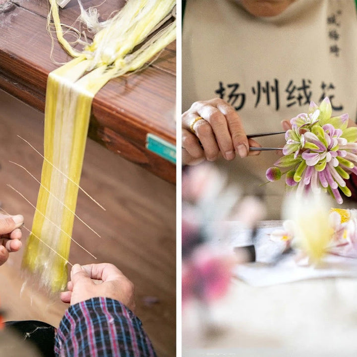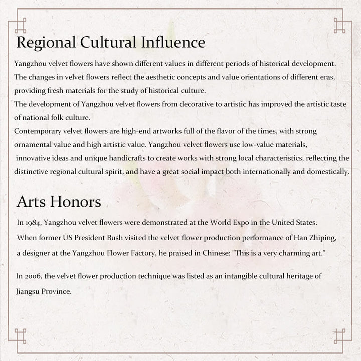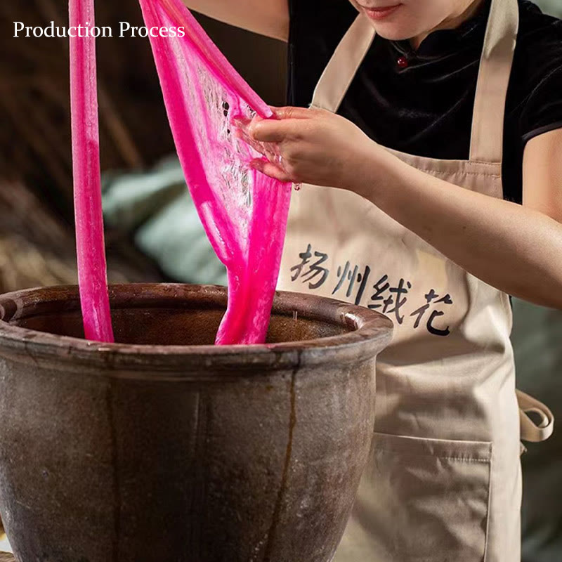 • Preservación del patrimonio cultural : el uso de la artesanía tradicional con flores de terciopelo resalta la importancia de preservar el patrimonio cultural y las habilidades artesanales. Esto muestra la belleza de la artesanía hecha a mano, en particular las intrincadas técnicas transmitidas de generación en generación en regiones como Yangzhou.