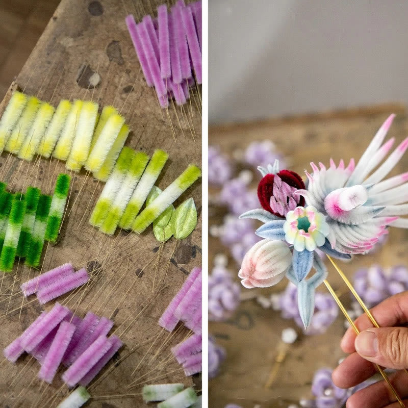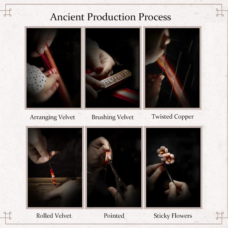 La popularidad de las flores de terciopelo de Yangzhou se remonta a hace 1.300 años. En primavera, Li Xian, uno de los emperadores de la dinastía Tang, designó las flores de terciopelo de Yangzhou como flores del palacio imperial para recompensar a sus amadas concubinas. En la antigua Yangzhou, la industria de la elaboración de flores estaba muy desarrollada y era una famosa zona de producción de flores artesanales en China. Entre las flores de Yangzhou, las flores de terciopelo tienen la historia más antigua, la mayor variedad y la mayor influencia.