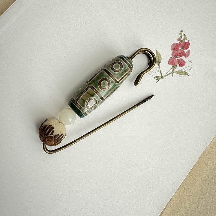 - Símbolo de iluminación y protección : la combinación de la cuenta Dzi de nueve ojos y la flor de loto con la semilla de bodhi en este broche simboliza la iluminación, el crecimiento espiritual y la protección. La cuenta Dzi de nueve ojos es venerada por su capacidad para alejar las energías negativas y traer buena fortuna, mientras que la flor de loto representa la pureza y el viaje hacia el despertar espiritual.