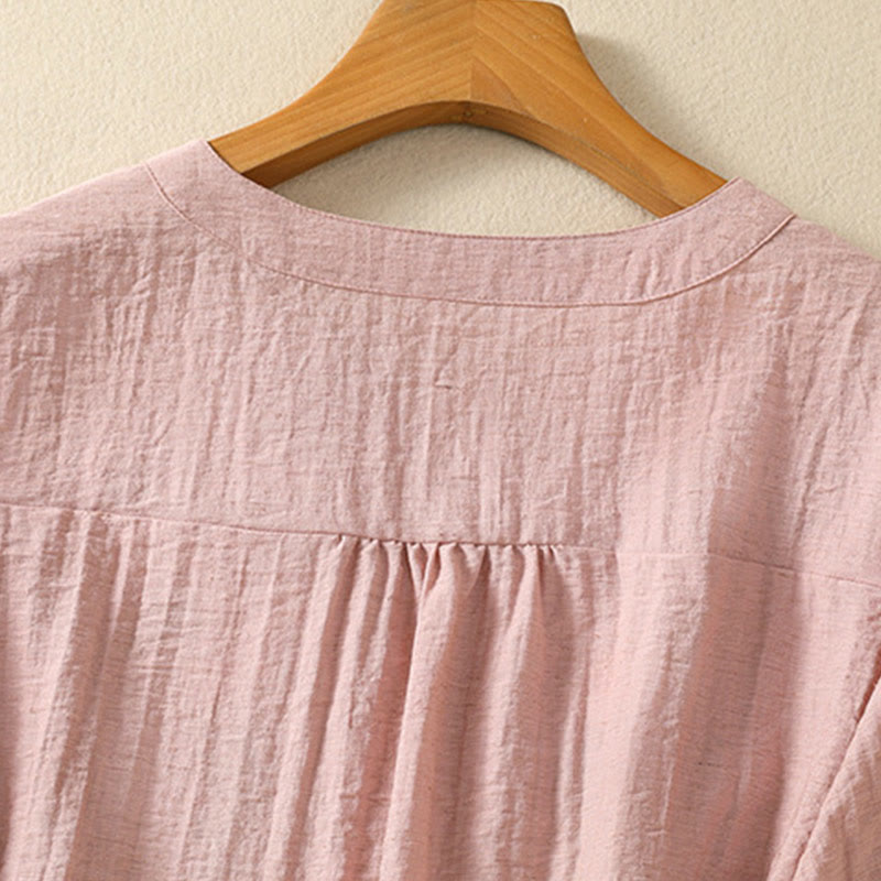 Camisa de algodón con cuello en V para mujer con bordado de flores, hojas y Buddha Stones