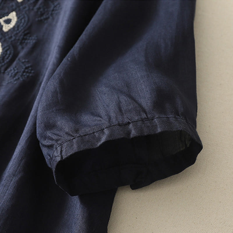 Camisa de lino y algodón con bordado simétrico de Buddha Stones para mujer, de media manga - image 12