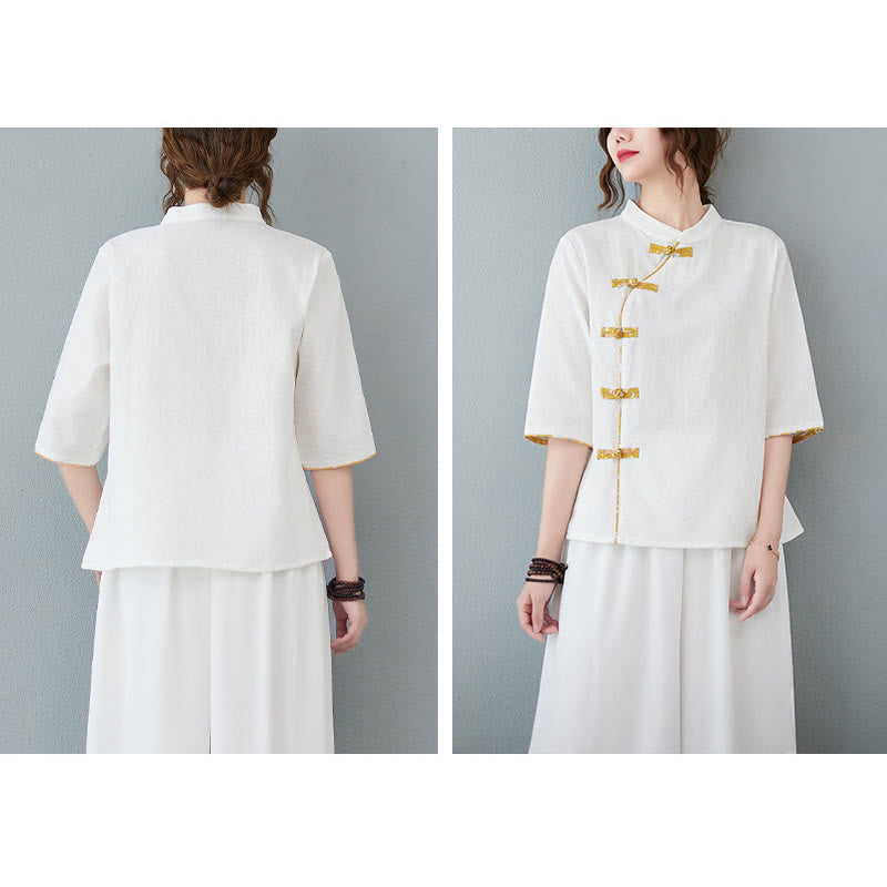 Camisa de lino y algodón con media manga y botones de rana con estampado floral de Buddha Stones