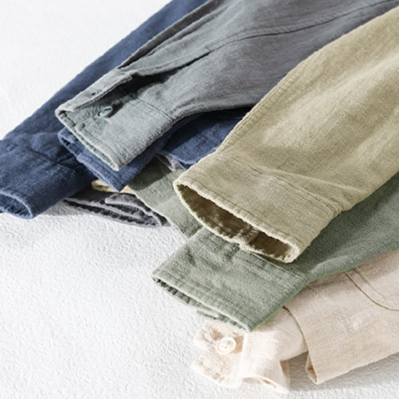 Camisa de lino y algodón de manga larga para hombre con solapa de color liso y bolsillo de Buddha Stones Commute Fall