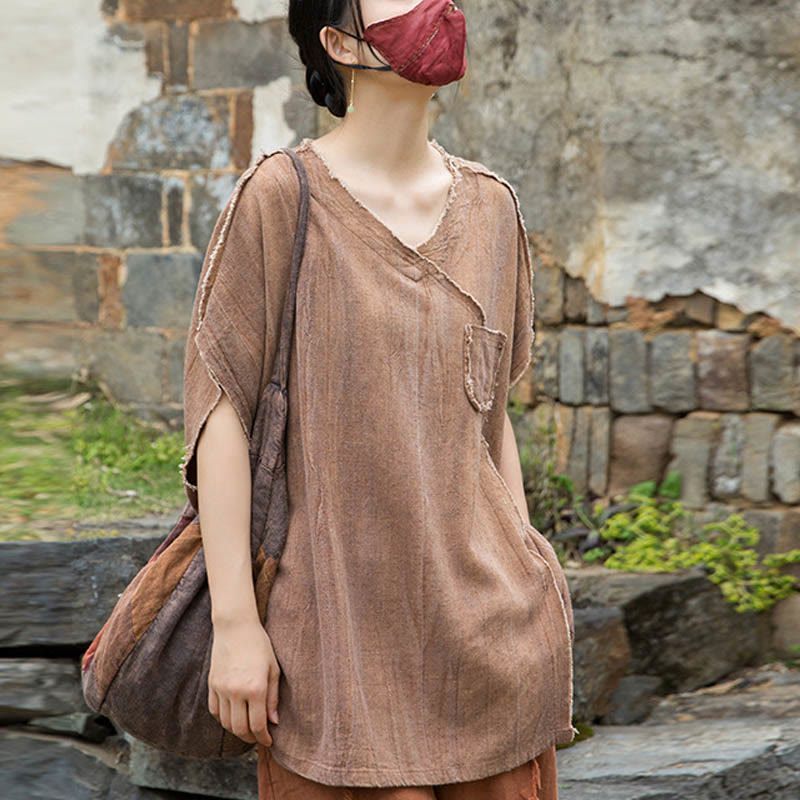Camisetas de lino con cuello en V y manga corta para mujer con estampado tie-dye de Buddha Stones - SandyBrown - US4-14, UK/AU8-18, EU36-46 (F) - image 12