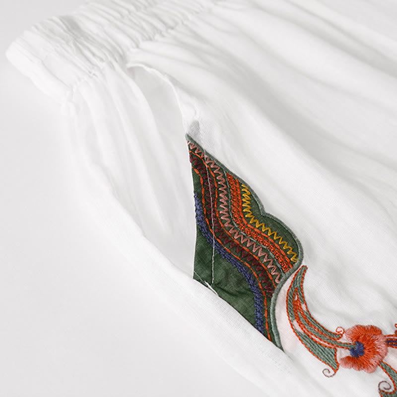 Pantalones anchos de lino y algodón con bordado floral para mujer, cintura elástica y bolsillos, estilo casual, con Buddha Stones