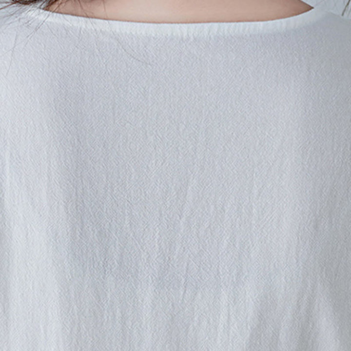 Vestido largo de lino y algodón con cuello en V, manga tres cuartos y diseño floral sencillo con bordado bohemio y Buddha Stones
