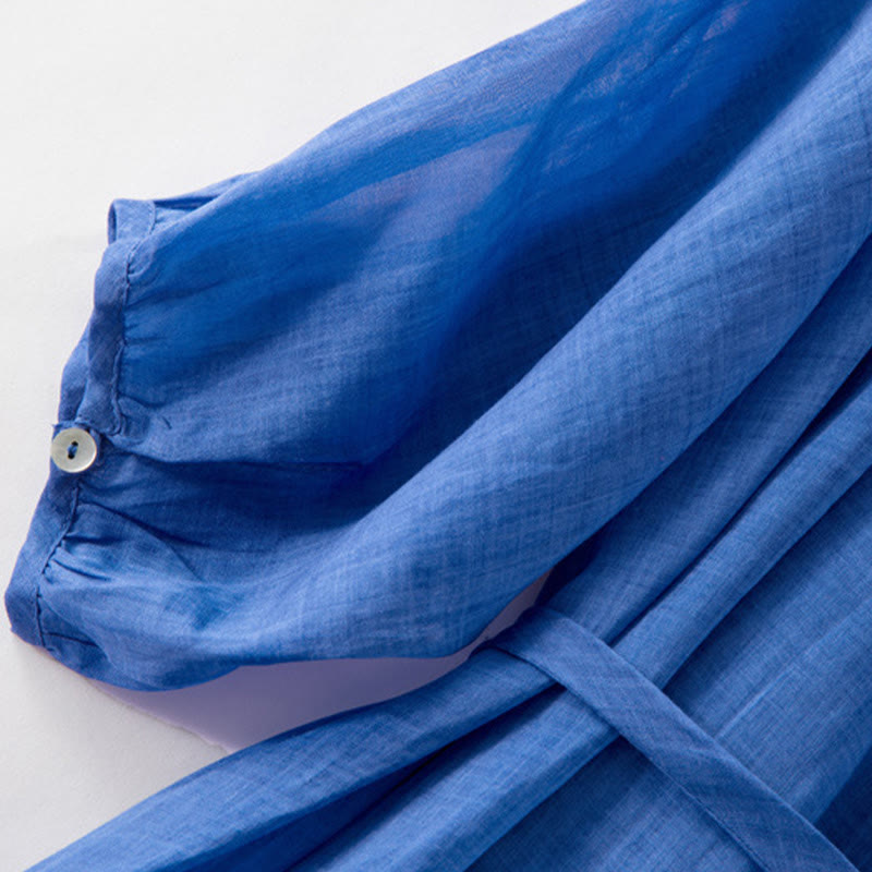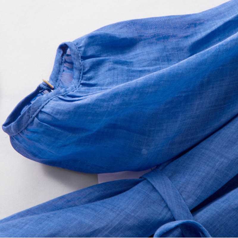 Vestido midi de lino y algodón con mangas abullonadas de tres cuartos y cordón ajustable, con estampado Buddha Stones y bolsillos - Azul - US12,UK/AU16,EU44 (XL) - image 1