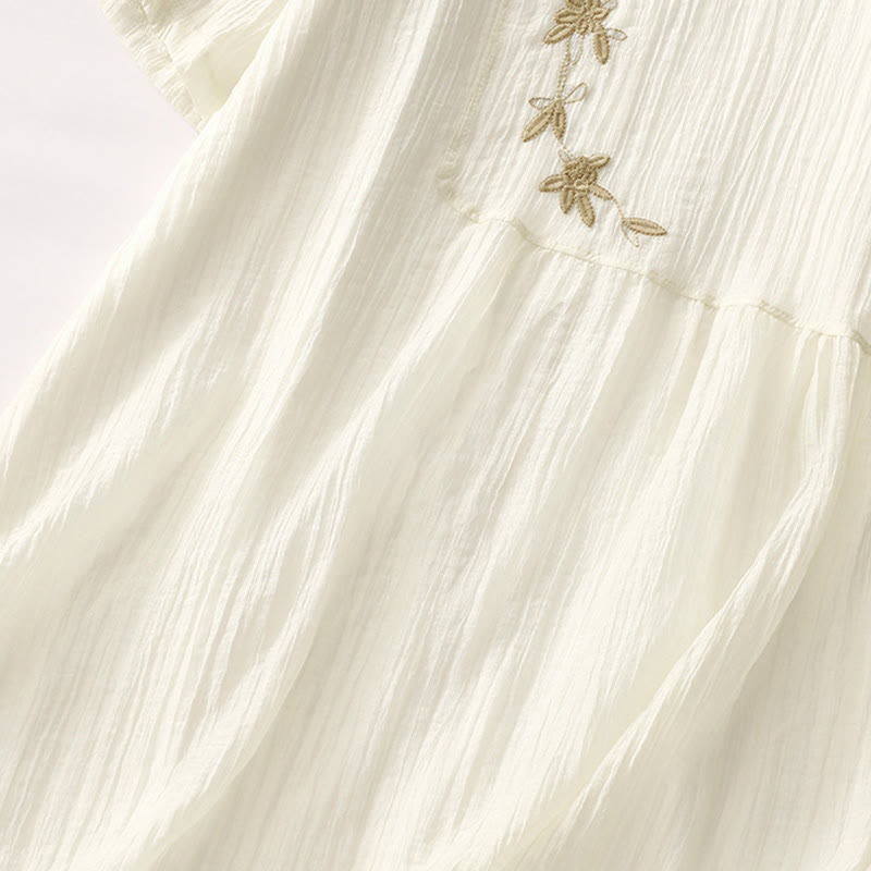 Vestido midi informal de verano con bordado liso y doble capa de algodón y lino de manga corta con Buddha Stones