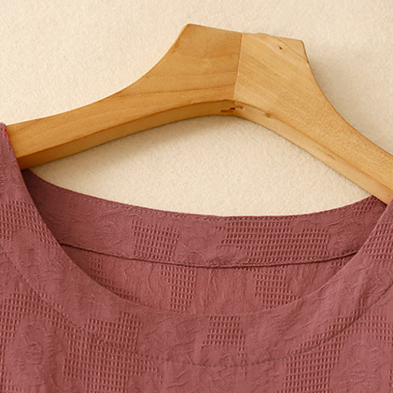Vestido midi de algodón de manga corta con cuello redondo y puños elásticos de jacquard de verano con Buddha Stones