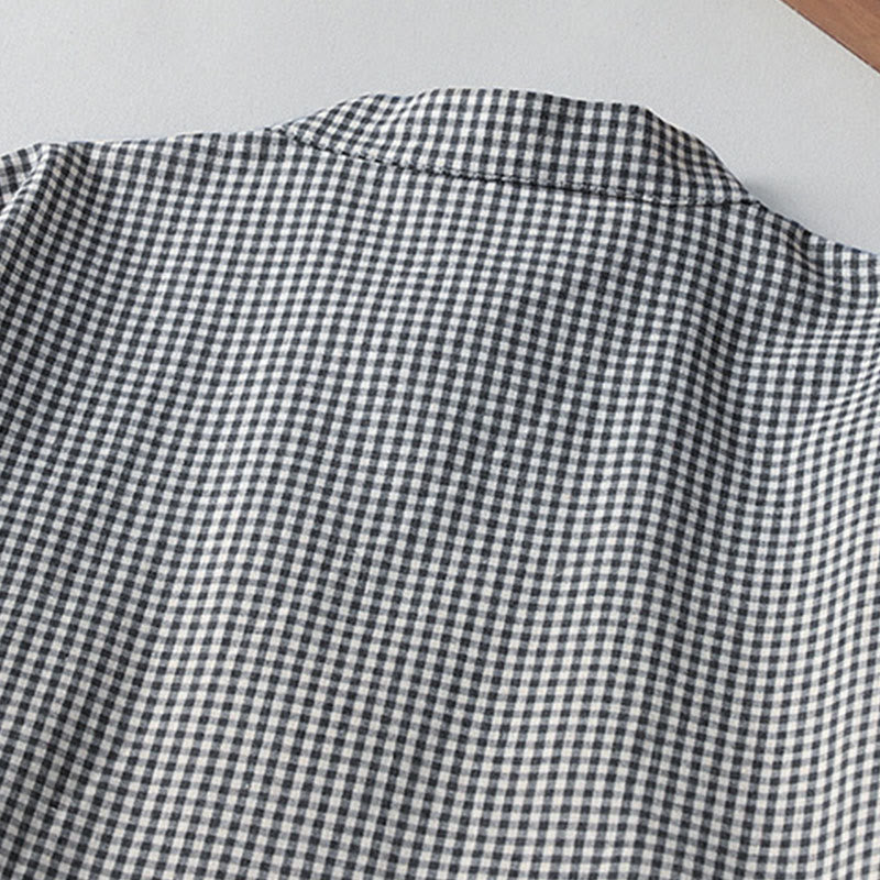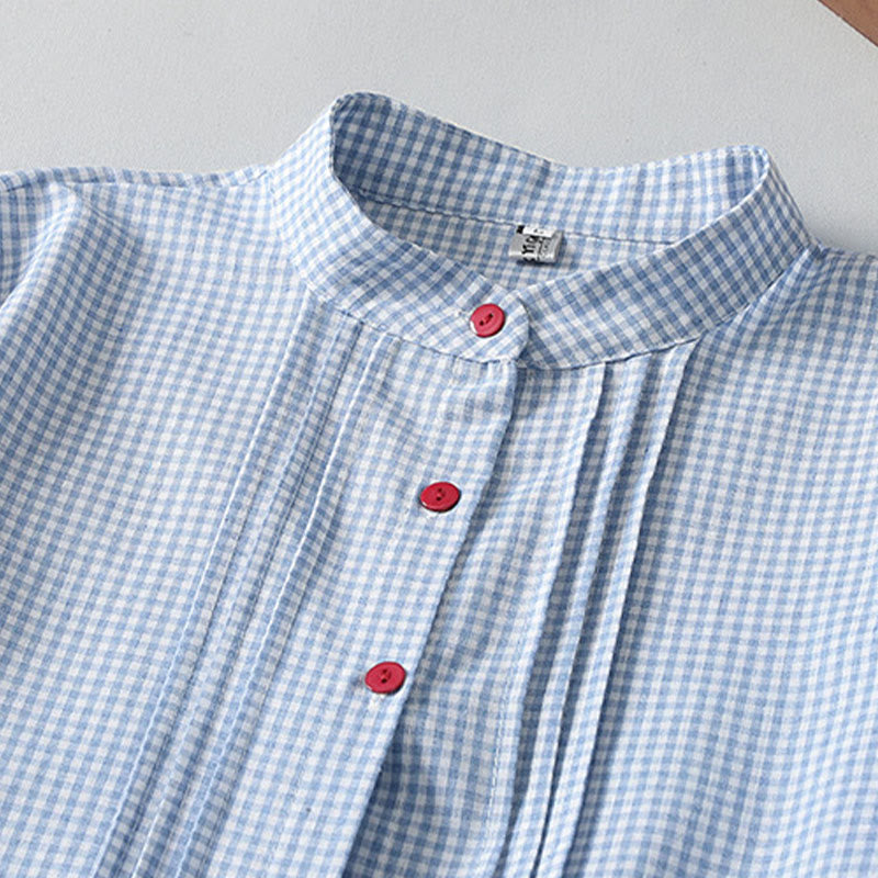 Vestido midi informal de lino y algodón con mangas largas tipo farol y estampado a cuadros con Buddha Stones y bolsillos