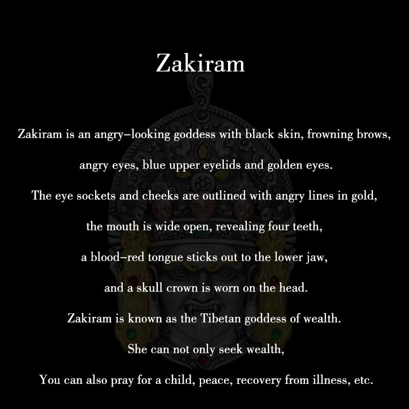 Zakiram es una deidad guardiana cuya imagen simboliza el poder de la tutela y protección de la fe y puede proteger a los practicantes del mal y la desgracia.