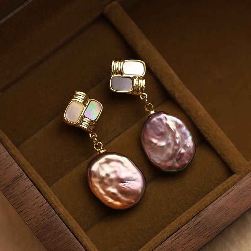 Pendientes colgantes curativos de perlas barrocas naturales de oro chapado en cobre con postes de plata de ley 925 con Buddha Stones - Perla Barroca Púrpura (Postes de Plata de Ley 925) - image 0