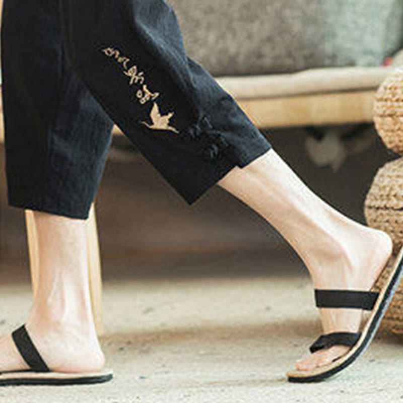 Pantalones harén cortos de algodón con bordado de grullas y Buddha Stones para hombre con bolsillos