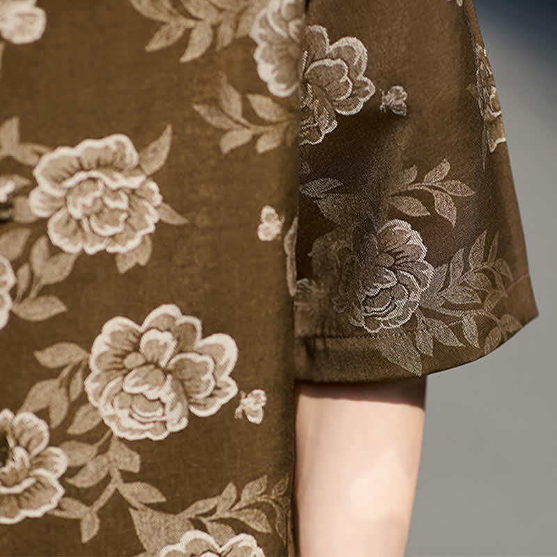Buddha Stones Camisa de manga corta para hombre con cuello mandarín, botones de rana retro y estampado floral en jacquard - image 11