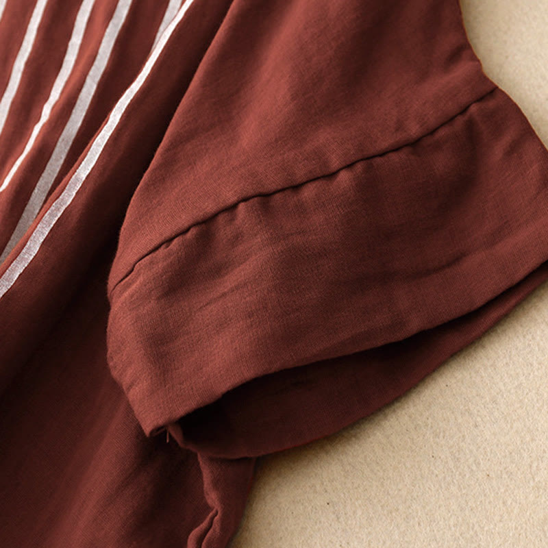 Buddha Stones Camiseta de lino y algodón de manga corta con estampado de líneas informales para mujer - RosyBrown - US12, UK/AU16, EU44 (2XL) - image 18