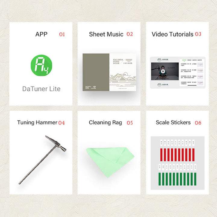 - El paquete incluye: Kalimba * 1, cancionero de Kalimba * 1, martillo de afinación * 1, pegatina de nota * 1, paño de limpieza * 1