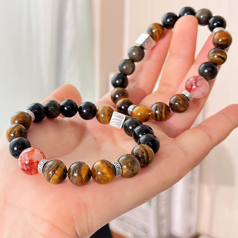Tamaño de la cuenta: Aprox. 10 mmMaterial: Ojo de tigre, obsidiana con brillo dorado, cuarzo con inclusiones