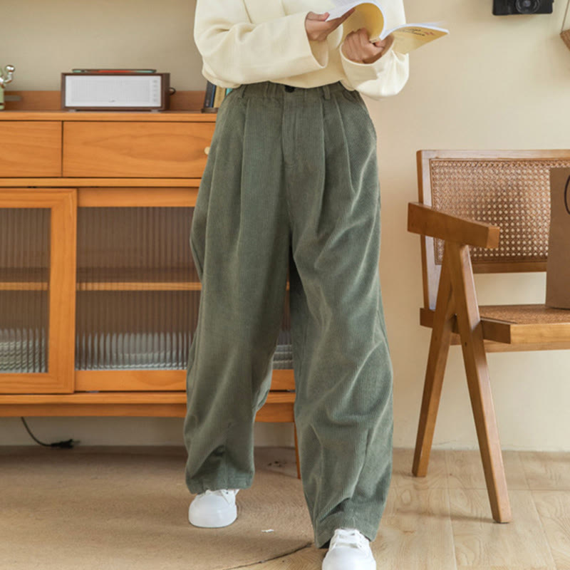 Pantalones de pana de algodón con cintura alta, cremallera y pernera ancha para mujer de Buddha Stones con bolsillos