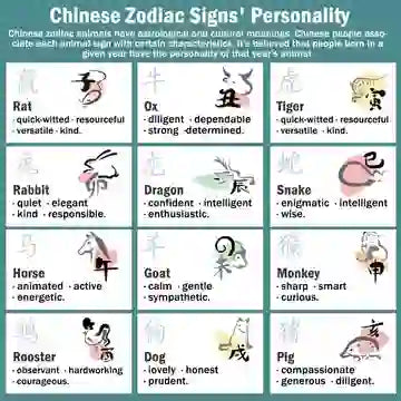 Los animales del zodíaco chino tienen significados astrológicos y culturales. Los chinos asocian cada signo animal con determinadas características. Se cree que las personas nacidas en un año determinado tienen la personalidad del animal de ese año.