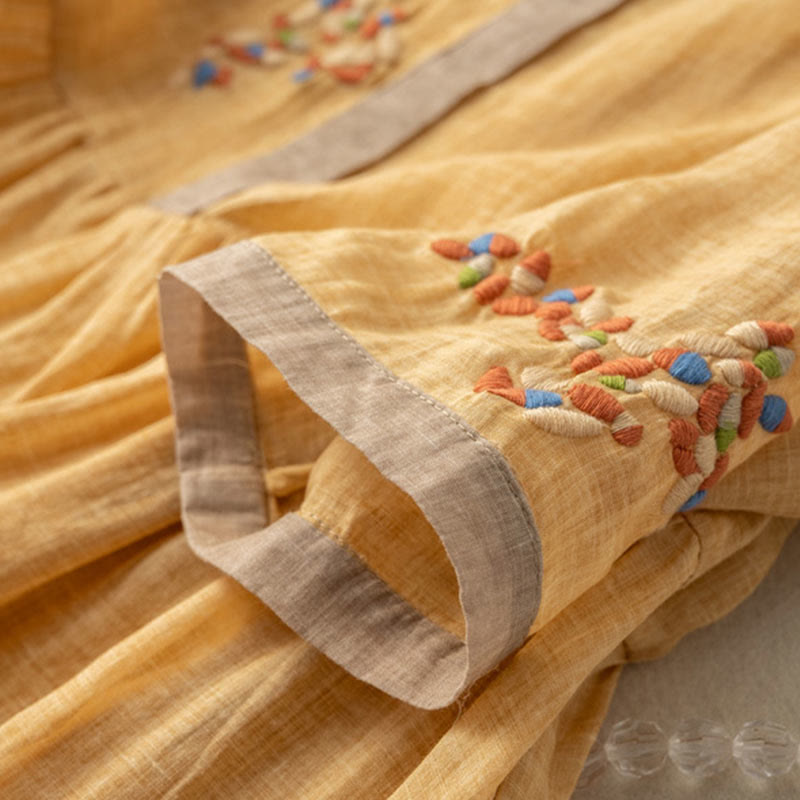 Vestido midi de Buddha Stones y lino con bordado étnico de primavera y media manga para mujer