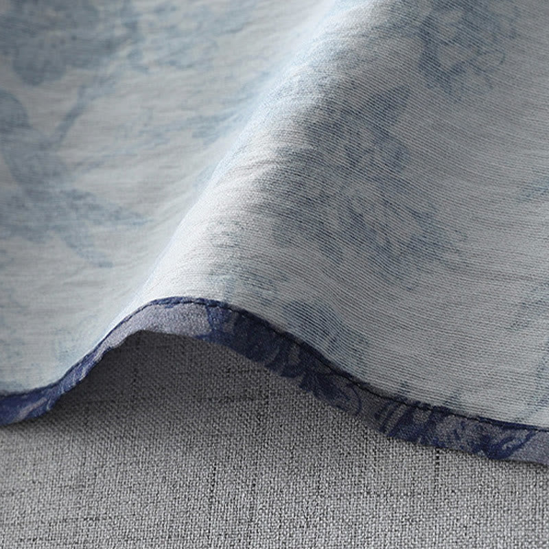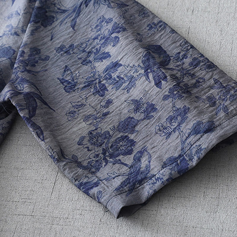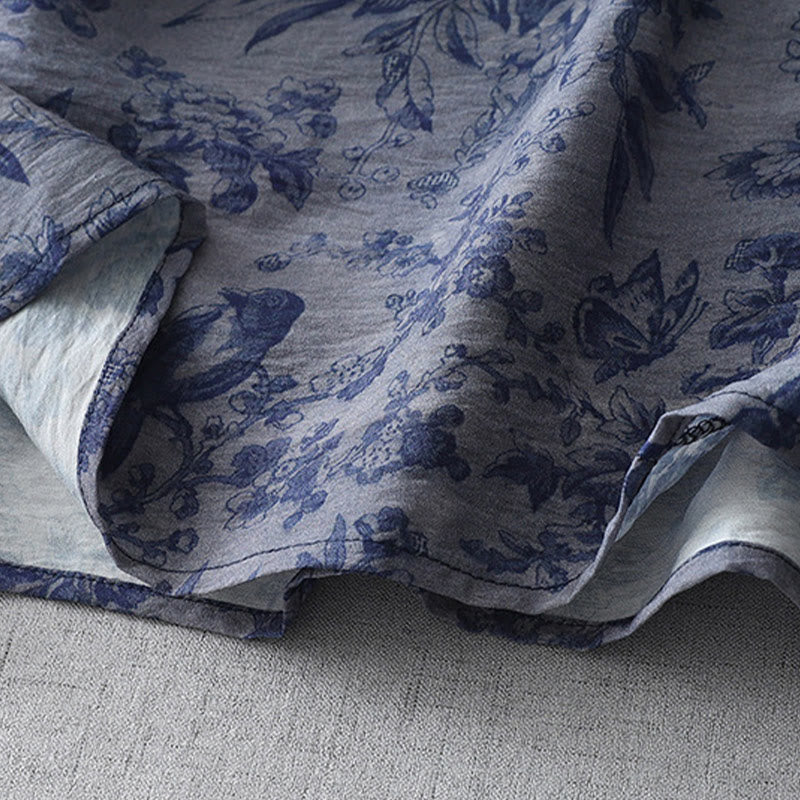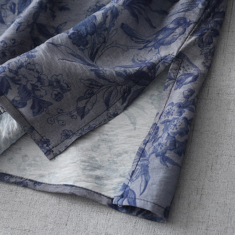 Vestido midi de algodón con cuello mandarín, media manga y botones de rana con estampado de hojas y flores de Buddha Stones - Azul real - US8-10,UK/AU12-14,EU40-42 (2XL) - image 0