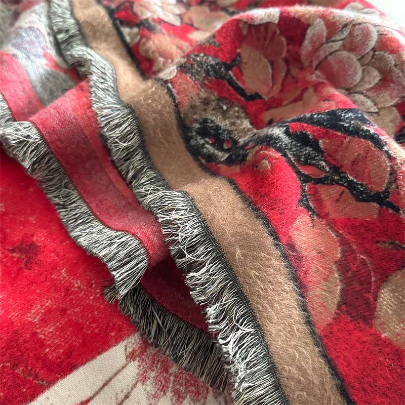 Bufanda chal suave y acogedora con borlas, diseño de flor de ciruelo, loto y grulla otoñal de Buddha Stones - Rojo - 180*65 cm - image 0