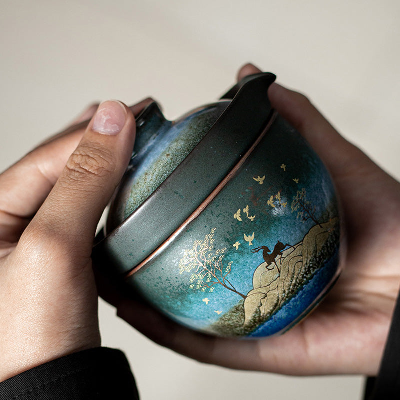 Taza de té de cerámica con piedras de Buda, ciervo, árboles de montaña, gato encantador, taza de té negro con tapa y bolsa