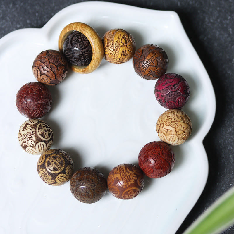 Pulsera curativa con Buddha Stones talladas en sándalo, símbolo del zodíaco chino, dragón auspicioso, fénix y Fu.